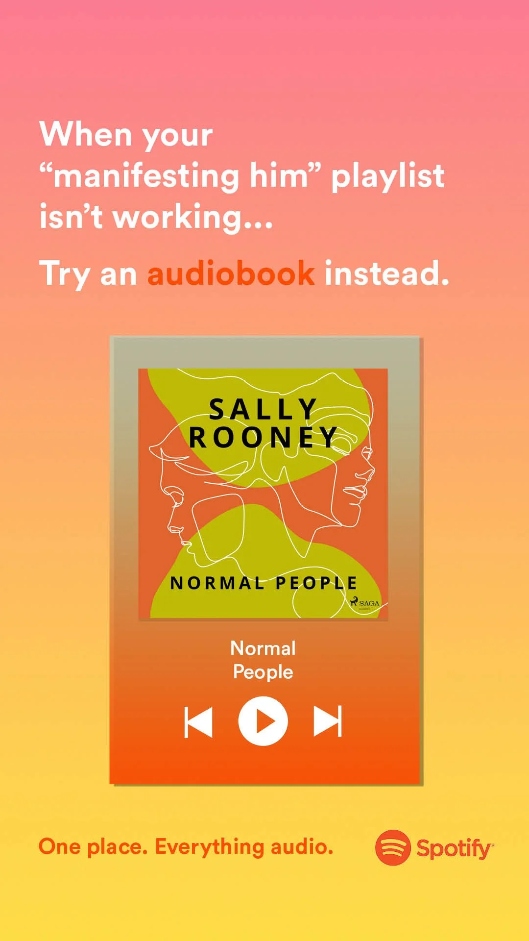 I decided we needed to get upstream of the problem. Spotify now has music, podcasts, and audiobooks. So everything pretty much. What if we just slightly repositioned Spotify as the place to go if you want to consume any audio content. Just make sure you mention audiobooks in every activation to really hit the brief home.